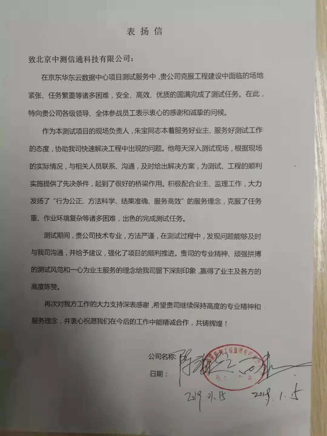此次測試工作圓滿完成,業主方贊不絕口,并提出書面表揚!