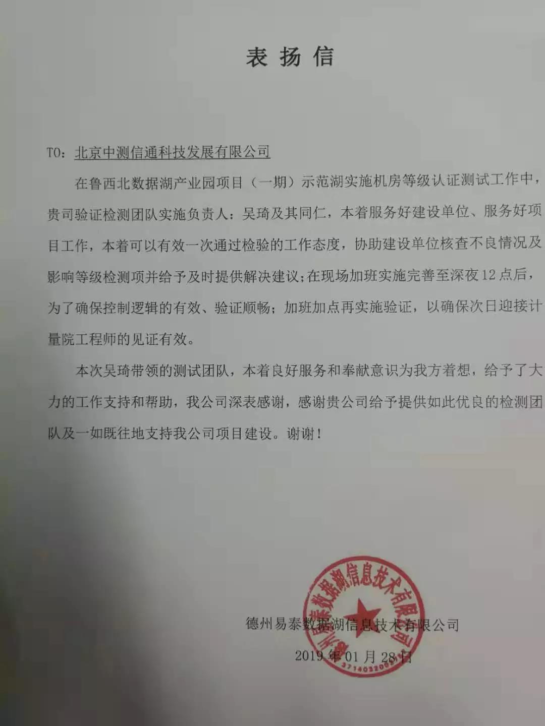 在魯西北數據湖產業園區項目(一期)示范湖實施機房等級認證測試的工作中,由項目經理吳琦帶領的測試團隊,本著服務業主單位,同時有效且一次通過檢驗的工作態度,加班加點實施測試,最終出色的完成測試!業主對此次工作給與好評并提出書面表揚!