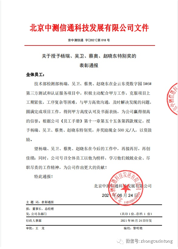 近期我司收到了來自金云東莞數(shù)字園工程部感謝信。信中對(duì)北京中測(cè)信通科技發(fā)展有限公司的專業(yè)服務(wù)和積極配合完成項(xiàng)目任務(wù)的工作態(tài)度給予了高度的認(rèn)可。“在項(xiàng)目中楊瑞、吳衛(wèi)、蔡奧、趙曉東認(rèn)真負(fù)責(zé)、積極配合、克服項(xiàng)目上的重重困難,加班加點(diǎn)任勞任怨,在項(xiàng)目實(shí)施過程中能夠高效溝通,及時(shí)解決發(fā)現(xiàn)的問題,保證了項(xiàng)目的順利進(jìn)行,對(duì)此我司特此提出表揚(yáng)”。在此非常感謝金云東莞數(shù)字園工程部對(duì)我們的認(rèn)可,我們會(huì)不斷的努力完善自己。向中國數(shù)據(jù)中心服務(wù)的標(biāo)桿企業(yè)邁進(jìn)。