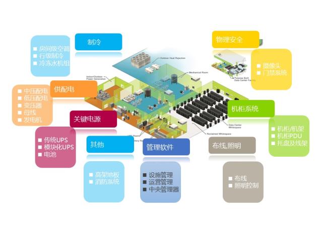 制冷----供配電---關鍵電源----機柜系統---布線照明---物理安全---管理軟件---其他