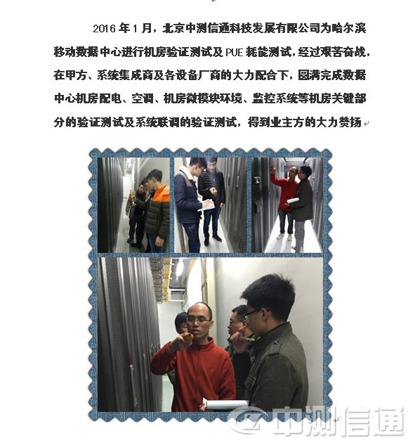 2015年8月,北京中測信通科技發展有限公司為哈爾濱移動數據中心進行機房驗證測試及PUE耗能測試,經過艱苦奮戰,在甲方、系統集成商及各設備廠商的大力配合下,圓滿完成數據中心機房配電、空調、機房微模塊環境、監控系統等機房關鍵部分的驗證測試及系統聯調的驗證測試,得到業主方的大力贊揚.